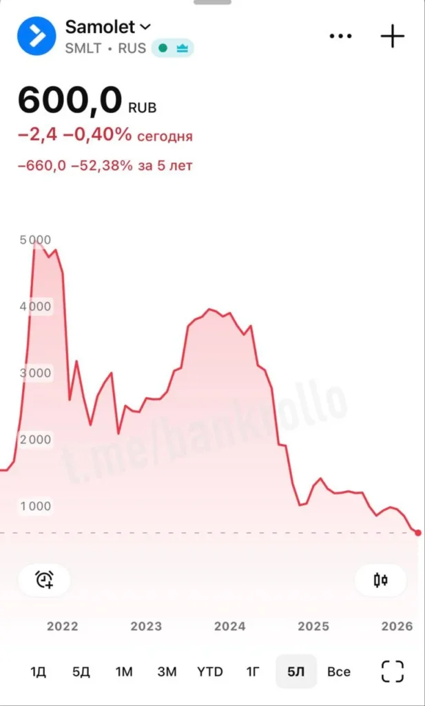 Акции крупнейшего застройщика России упали до 600 рублей за бумагу, установив новый исторический минимум. В 2021 году стоимость акций превышала 5 тысяч рублей.