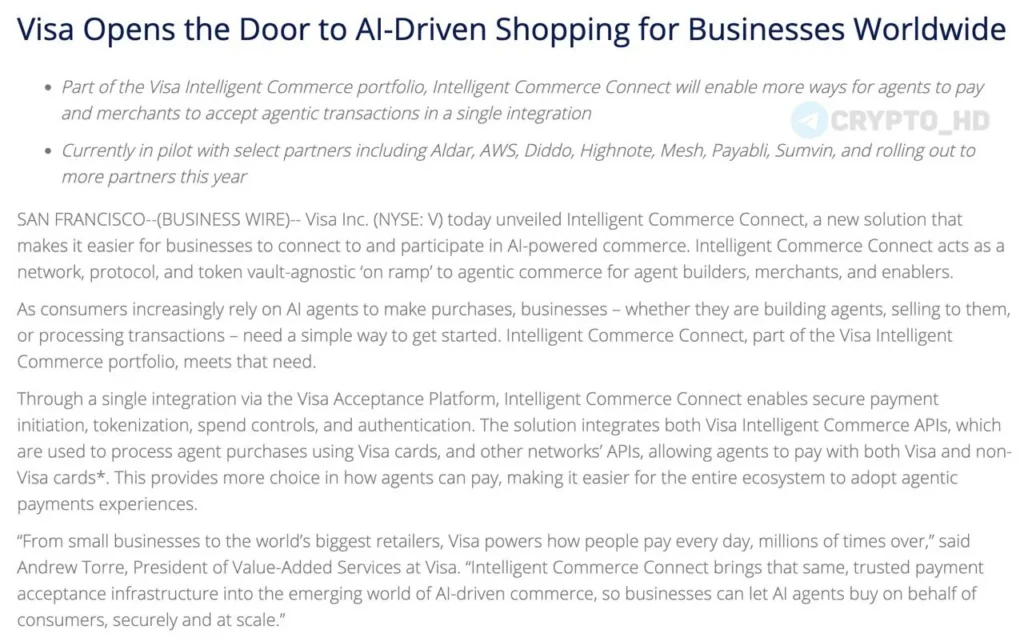 Visa анонсировала платформу «Intelligent Commerce Connect», которая позволяет AI-агентам совершать покупки за пользователя. Технология поддерживает карты Visa и других систем, обеспечивая безопасность через токенизацию и