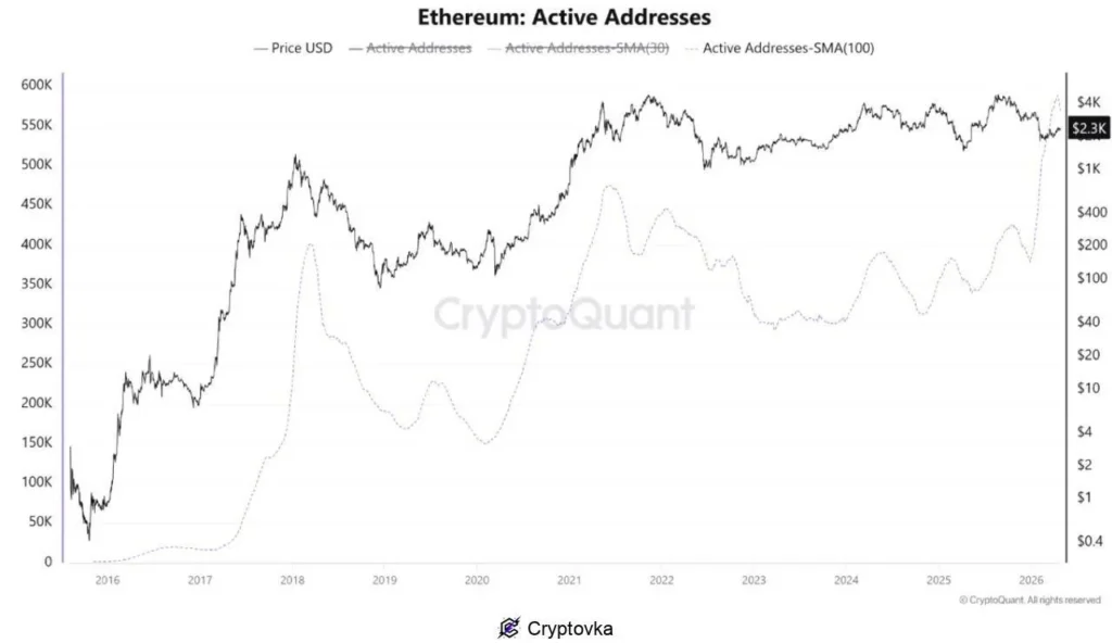 Ончейн-метрики Ethereum показывают редкий бычий сигнал: 100-дневная средняя активных адресов достигла исторического максимума в 587 тыс., несмотря на снижение цены. Аналитики связывают это с ростом реального спроса и воз