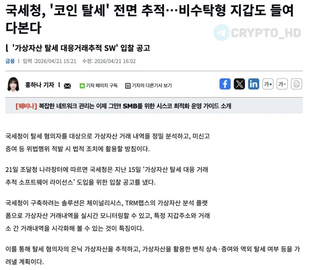 Налоговая служба Южной Кореи заказала разработку программного обеспечения для мониторинга транзакций в некастодиальных криптокошельках. Запуск системы запланирован на 2026 год.