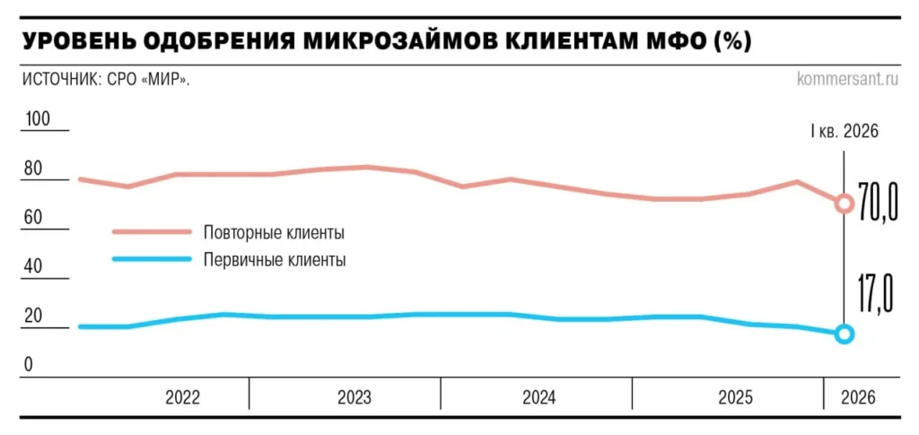 Доля одобрения микрозаймов в первом квартале 2026 года упала до 17% для новых клиентов и 70% для повторных — худший показатель с 2022 года. Причина — ужесточение проверки доходов, что грозит рынку снижением объемов выдач