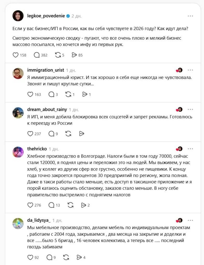 Предприниматели в России сообщают о резком спаде бизнеса в 2026 году. Выручка упала многократно из-за блокировки соцсетей, налоговой реформы и снижения спроса. Многие закрывают дело, распродают остатки или уходят в найм.
